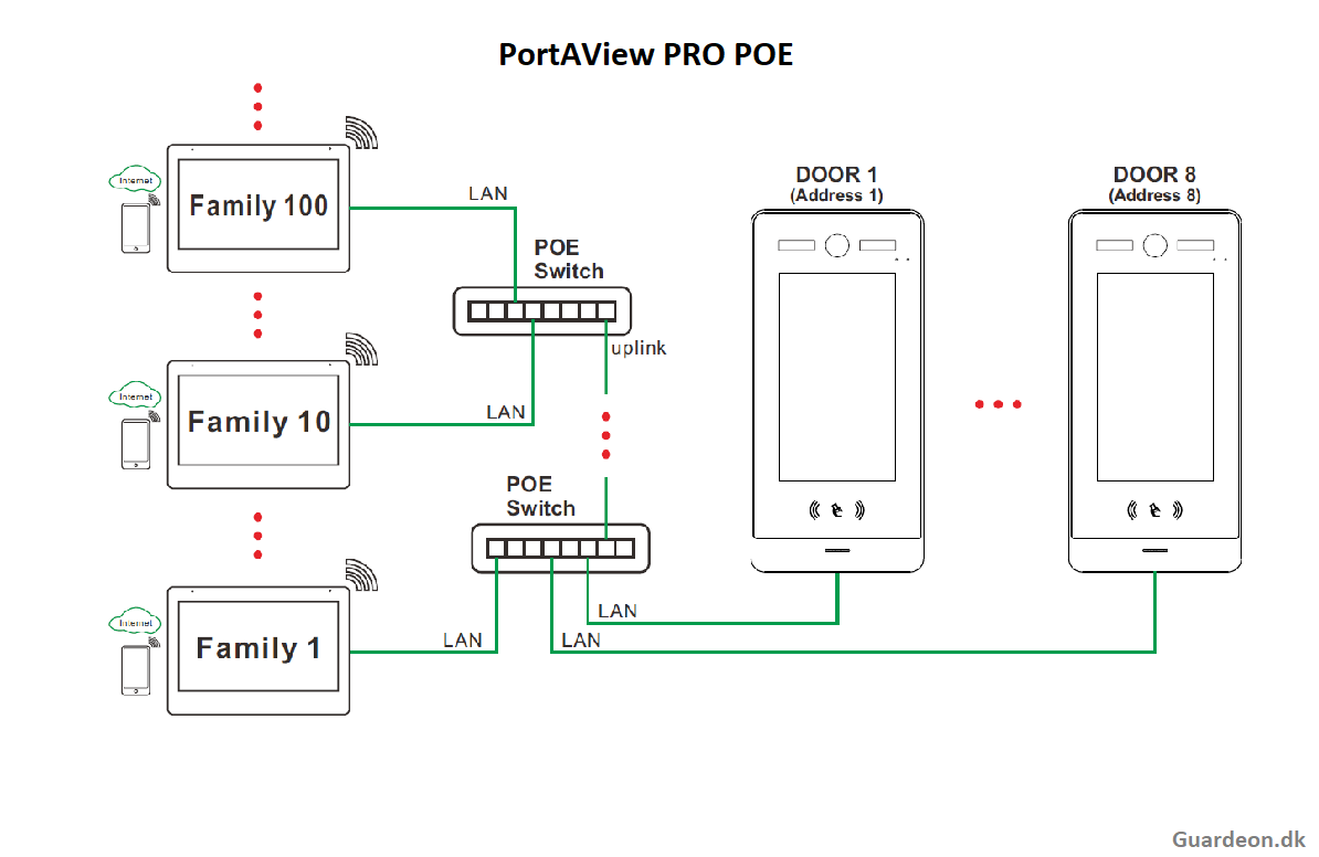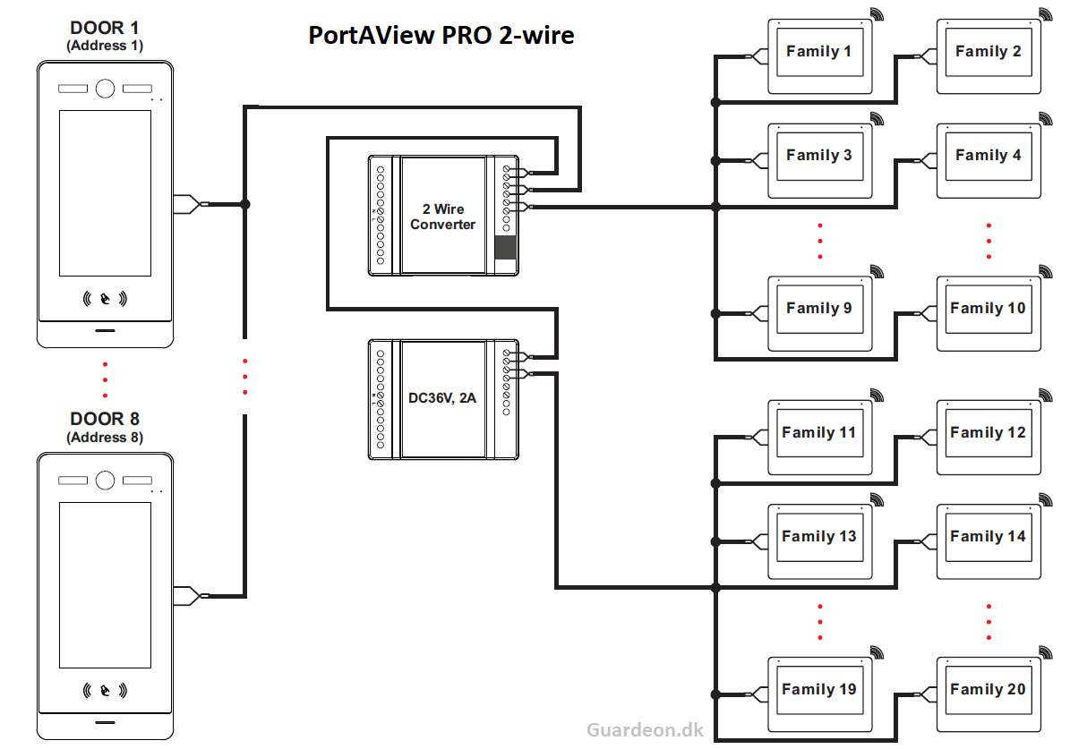 GPV-B300MMF 2 leder bus samt IP multibruger dørtelefon, app, kortlæser Forside » Dør & Porttelefon » PortAView PRO Varenr.: 131280Login for pris Antal Køb På lager Video dørtelefon tableau med video app samt briklæser 7" hvid touch HD monitor 2-leder bus og PoE LAN 2.0 MP full HD farve dag/nat kamera, 2-leder bus / LAN Kamera med indbygget IR natbelysning 2 stk. relæ udgange indbygget i dørstationen (dør og port) Indbygget Mifare og NFC (samt Android NFC) kortlæser i tableau Kortlæser kan benyttes som standalone eller wiegand til ADK systemer. Op til 999 lejligheder Op til 10.000 brugerpladser (elektroniske brikker/nøgler) 3 kodepladser til eks. (master / vicevært / postbud) Betjenes via app. med live video, audio, døråbning samt optage funktion ( gratis app ) GPV-B300MMF 2 leder bus + IP multibruger dørtelefon PortAView PRO Kan køre på forskellige typer 2-leder kabel (kræver KUN 2 ledere) Kan også køre på PoE og IP netværk LAN Betjenes nemt via 7" touchskærm Wiegand 26 / 34 bit udgang til eksterne adgangskontrol systemer SIP 2.0 video interface Indgang for UD-tryk Bred synsvinkel, vertikal 125° Max. bus 300 kabel meter (op til 999 stk. monitorer og 8 stk. dørstationer) 10 valgfrie ringetoner Mange indstillingsmuligheder via monitor Op til 10 brugere på app. (pr. lejlighed), GRATIS app. Relæ 1 og 2 kontaktsæt: max. 36V AC/DC 4A - dørstation Bus forsyning: 18 - 36 VDC eller POE (max 6W) - udestation Tæthed: IP65 IK7, vandalsikker (tempereret glasfront) HD skærm: 1024x600 pixel Arbejdsområde: -40° til +60°C for udestationen Dimensioner: Udestation 268H x128B x 26D mm. Skal benytte monitor som svarenhed, som også er gateway til app. Læs mere Manual Måske er du også interesseret i følgende produkter GPVM-B300BT 7" touch HD monitor med app, 2-leder bus Login for pris GPVM-IPBT 7" touch HD monitor med app, IP Login for pris Dørtelefon LAN controller 2L-BUS/PSU/LAN Login for pris